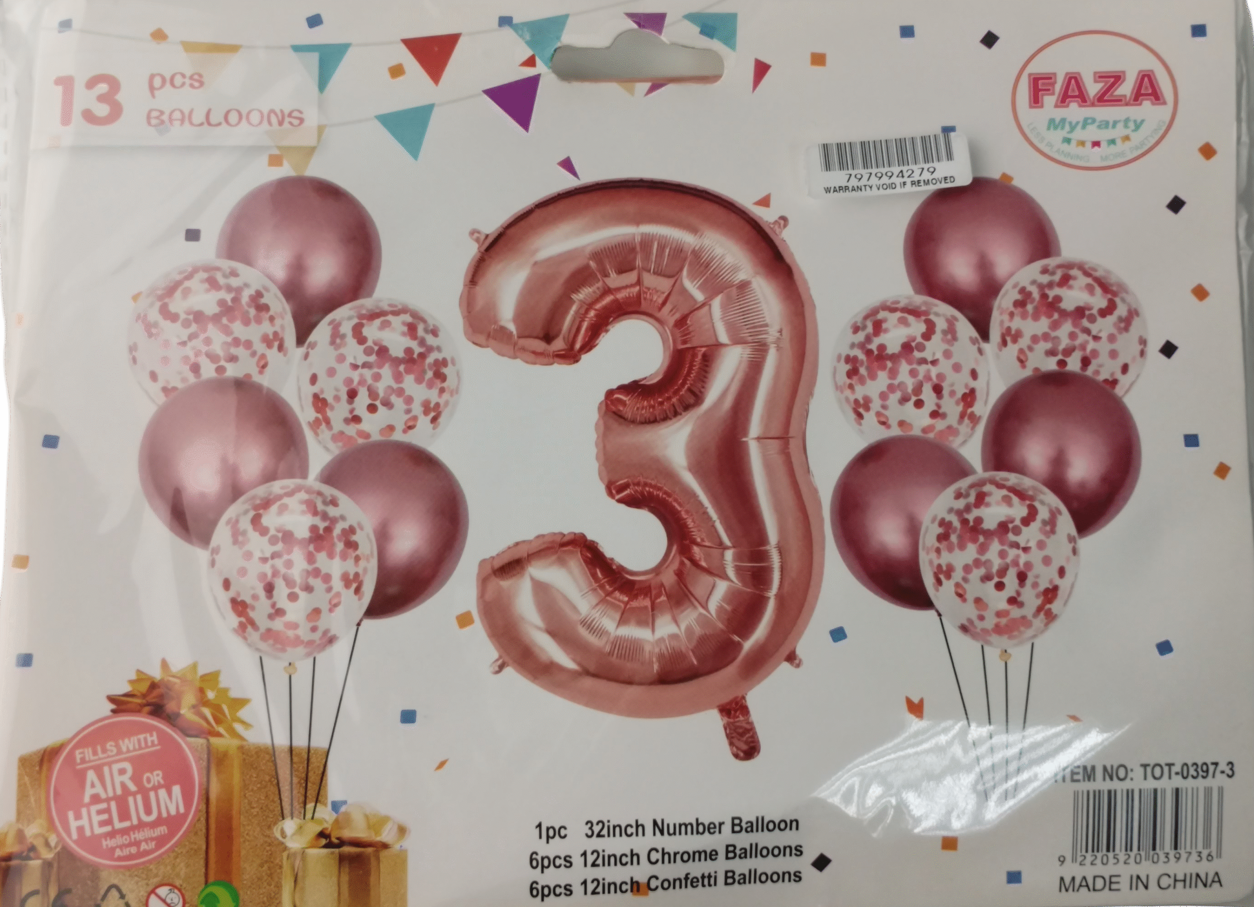 Casey 13pc Rose Gold and White Balloon Set Nr.3 – 13Pc set consisting of 1 x 81cm Number Balloon, 6pc 30.5cm Rose Gold Balloons, 6pc 30.5cm Confetti Balloons Retail Packaging No Warranty