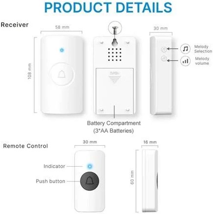 Digitech Wireless Doorbell – 100 Metres Distance, 1x Bell Transmitter Button, 1 x Bell Receiver box. Wireless, 38 Selectable Melodies, and Three Volume Levels, Receiver Battery 3 x 1.5v AA Batteries Not Included, Easy to Install, Color White, Retail Box, 6 Months Warranty.